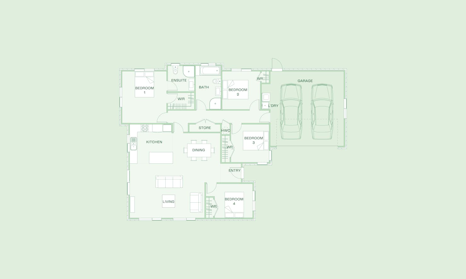 The Kereru plan offers a perfect family home with four spacious bedrooms, open plan living, and a double car garage. Natural light fills the stylish yet functional kitchen through ample windows. The north-facing communal living areas maximise the section layout, with a generous patio area completing the indoor/outdoor living experience. This design offers great value without compromising on quality, and lends itself well to tailor-made changes, such as converting a bedroom into a second lounge.