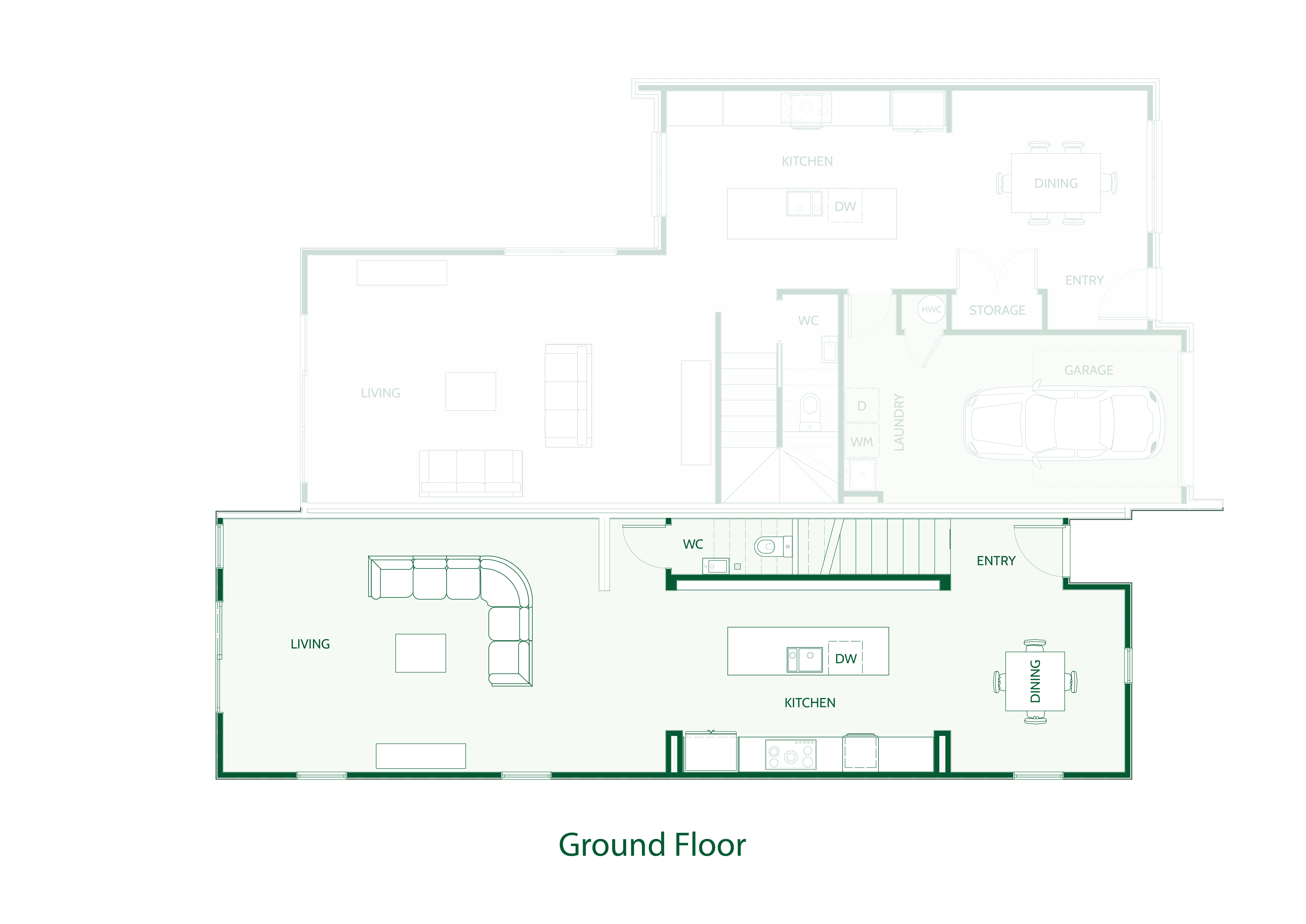 - Open plan kitchen, dining, and living area