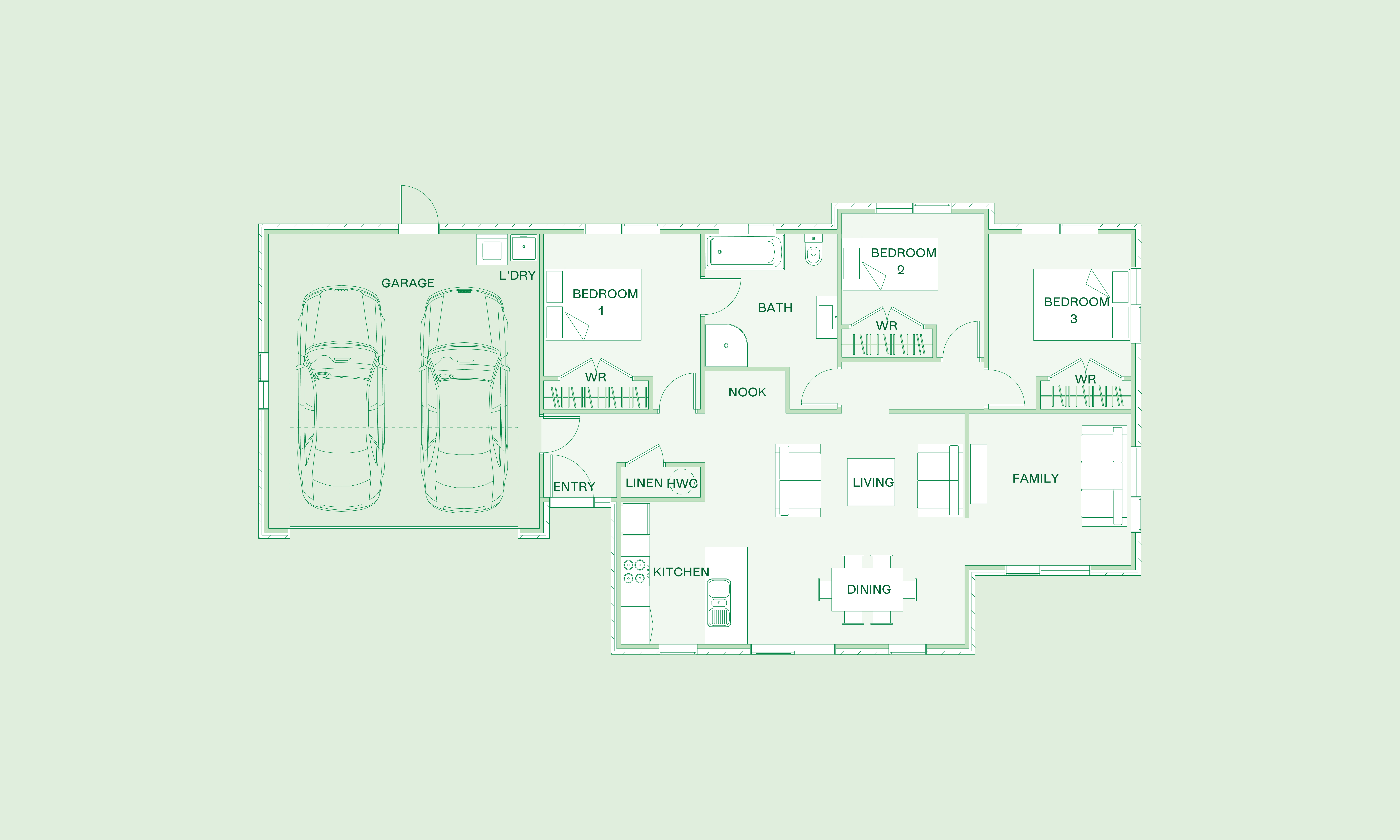 Our three-bedroom Taiko plan is a compact home with all the modern features. The cleverly designed floorplan allows for two double bedrooms, one single bedroom and expansive, light-filled living spaces.