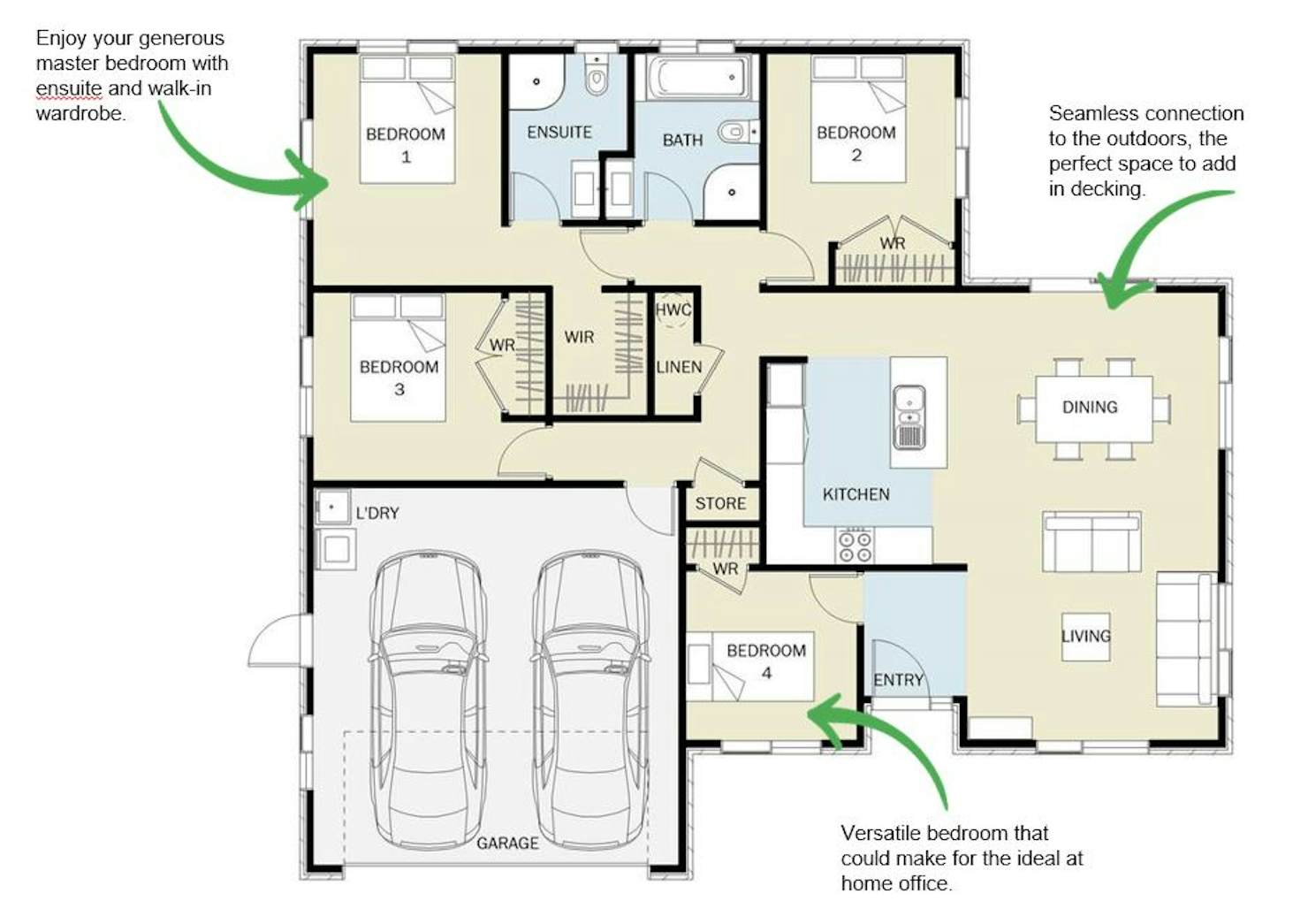 Experience all-day sunlight on this north-facing 600m² section, located in Stage 7 of The Landing, One Tree Point. The 162m² Bellbird floorplan strikes the ideal balance between low-maintenance living and modern design, boasting four bedrooms, two bathrooms and an open-plan kitchen, living, and family area.