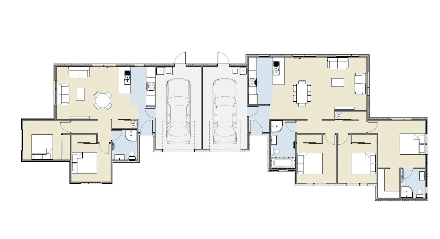 - Duplex: main home comprised of three bedrooms + two bathrooms + single garage. The unit has two bedrooms + one bathroom
