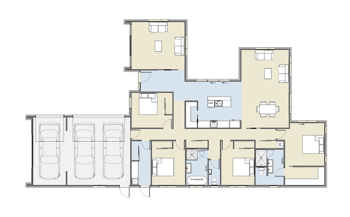 The Matuku 250 is a standout design that truly makes the most of its north-facing orientation, flooding the home with natural light throughout the day. Designed to sprawl comfortably across the generous 770m² section, the floorplan offers an exceptional sense of space and flow, with living areas perfectly positioned to capture sun and connect seamlessly to the outdoor living areas. Multiple living zones provide flexibility for families of all stages, whether it’s relaxed day-to-day living, entertaining, or giving everyone their own space to unwind.