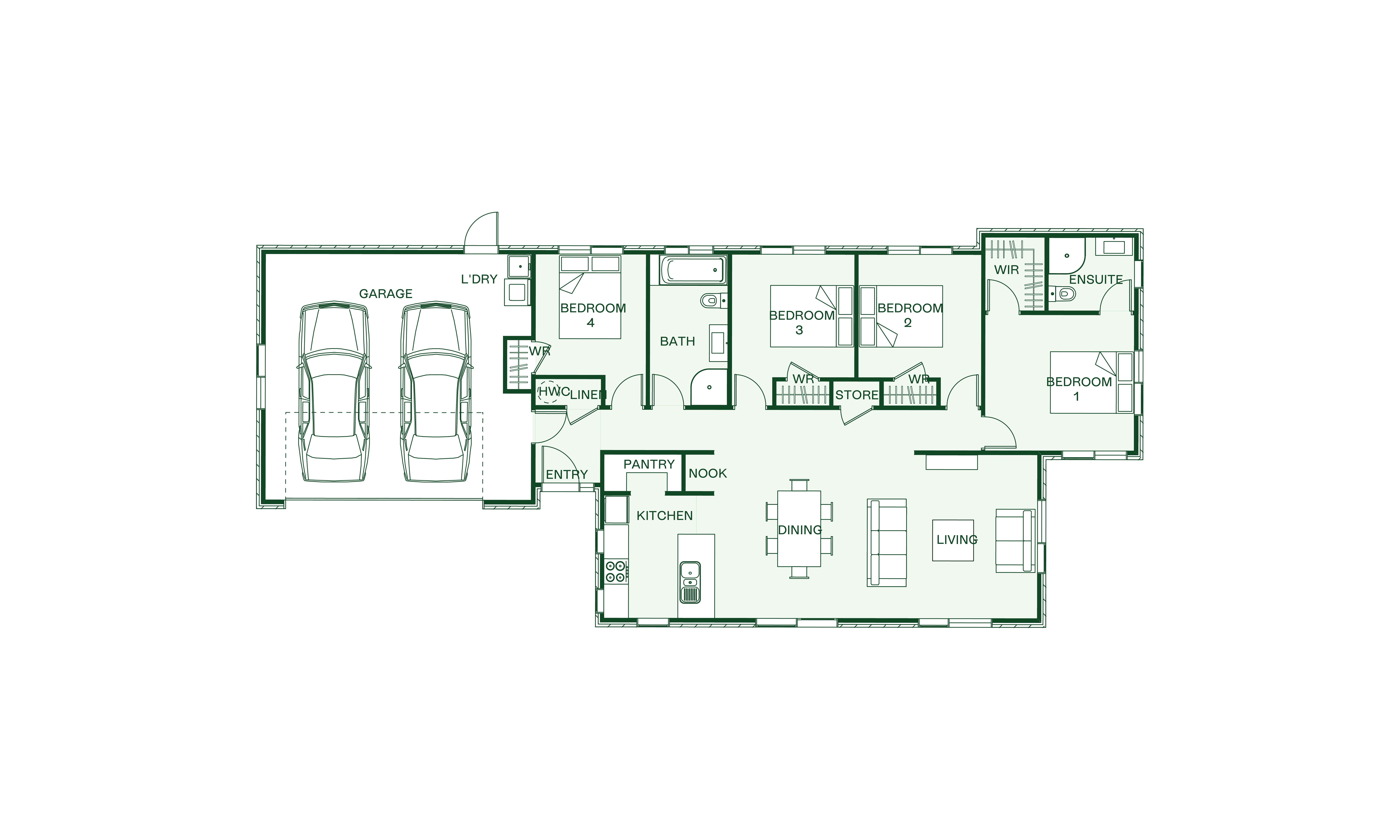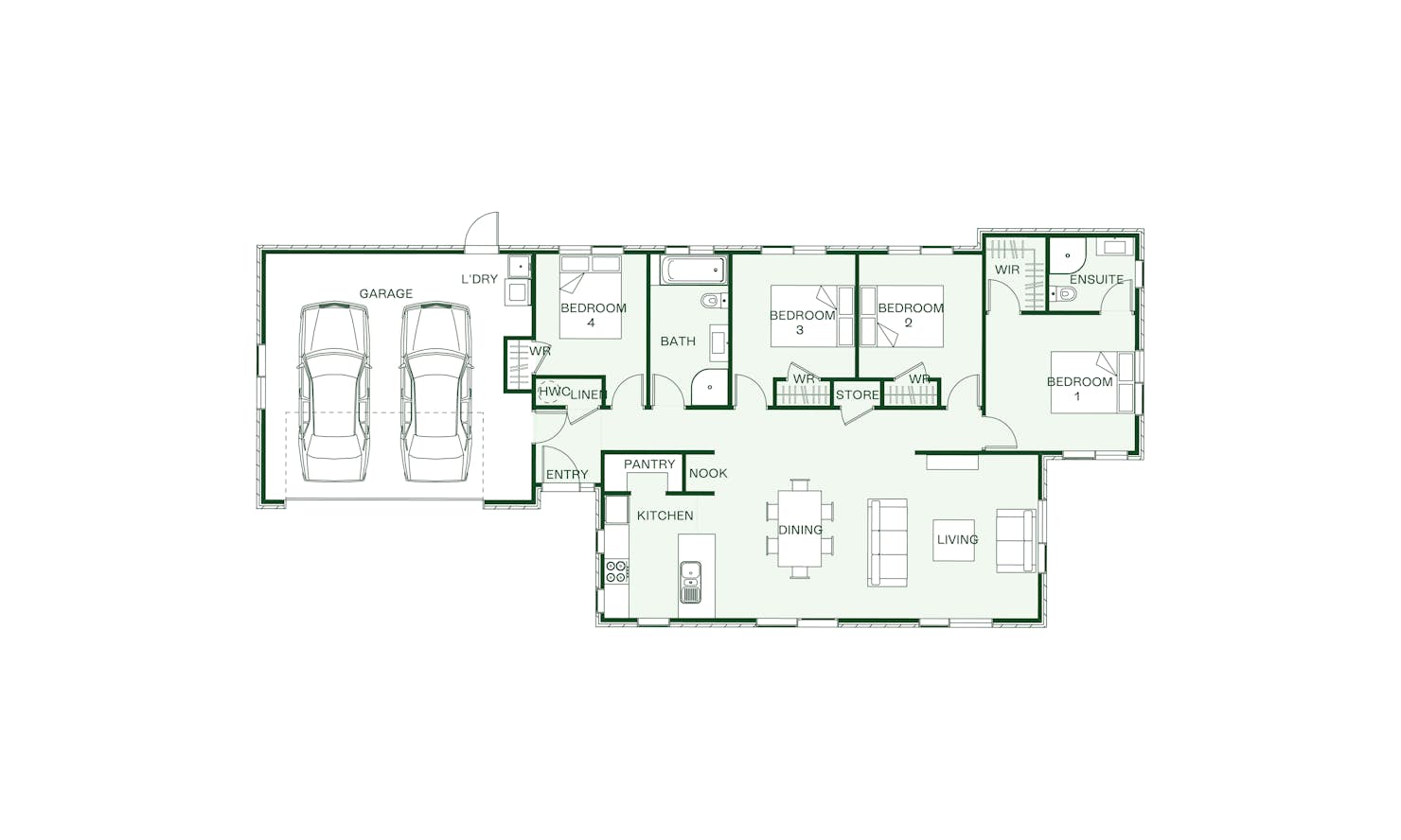 Fusing style and functionality, there is a lot on offer with the four-bedroom Kakariki plan. The open plan layout welcomes light into your home, with multiple areas to access the outdoors. The modern kitchen comes complete with a large pantry and a study nook just around the corner. This plan has all of the attributes that make for a great family home.