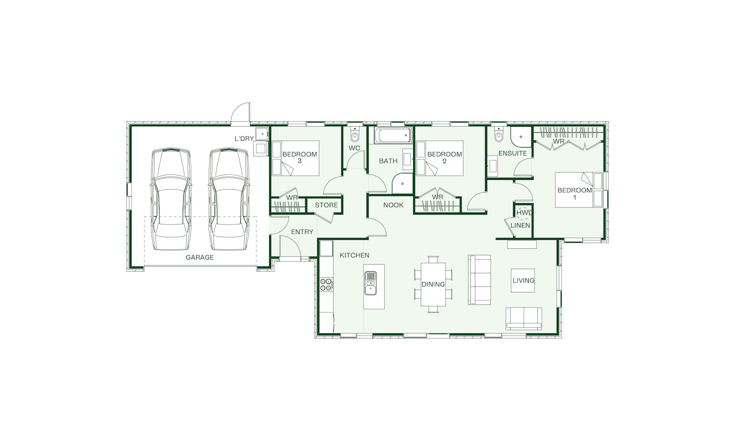 The Kiwi plan makes for an ideal family home with three generous bedrooms, open plan living and double car garaging. Daylight shines through to the modern kitchen thanks to ample windows - add some flair to your home with a glass window splashback.