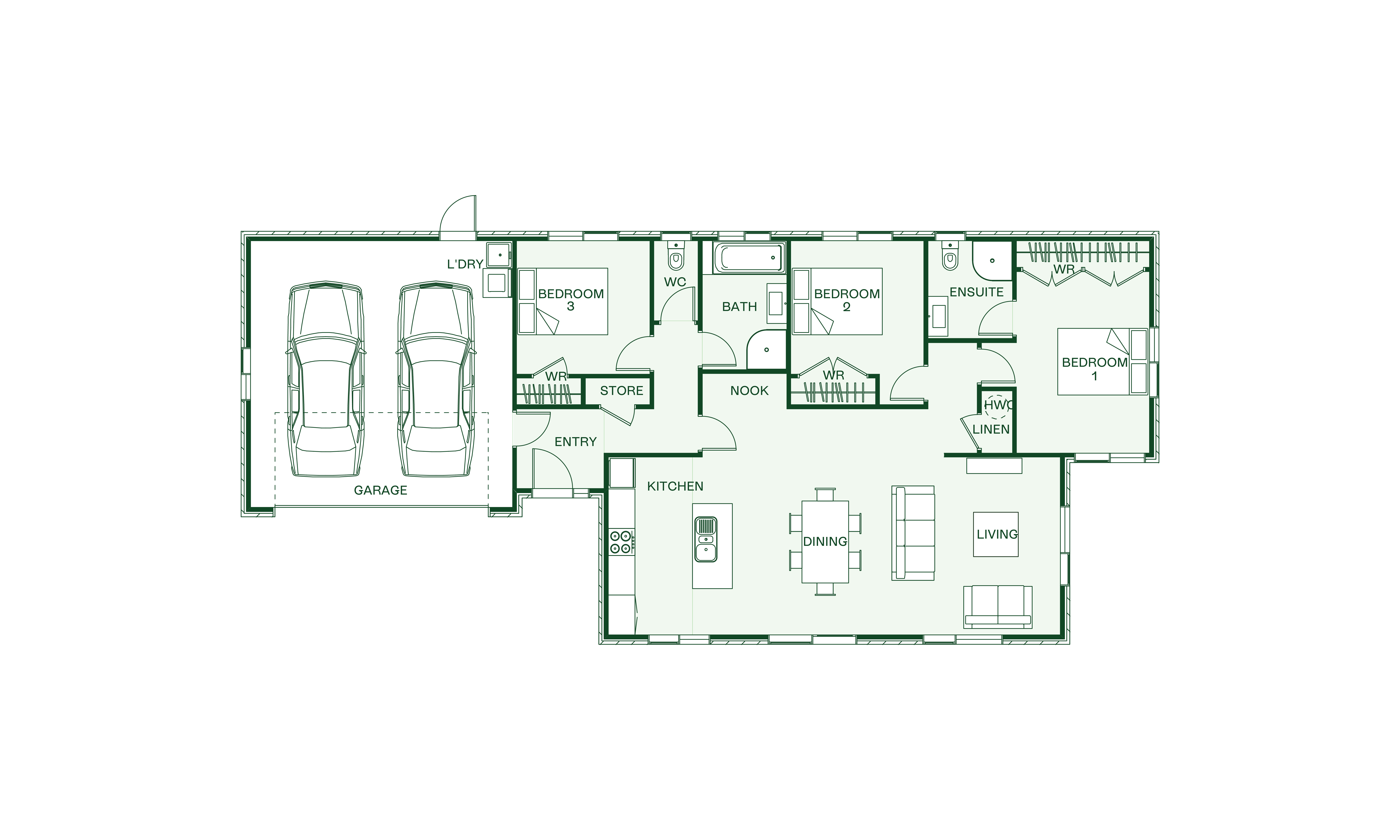 The Kiwi plan makes for an ideal family home with three generous bedrooms, open plan living and double car garaging. Daylight shines through to the modern kitchen thanks to ample windows - add some flair to your home with a glass window splashback.