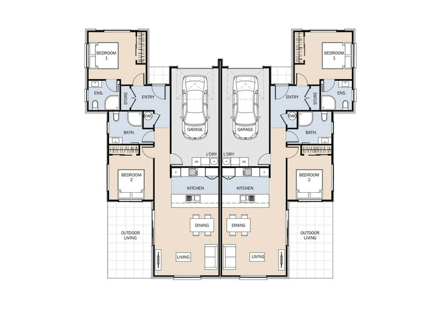 Perfect for easy family living, this cosy two bedroom, two-bathroom single-storey duplex design results in two high-quality homes that are stylish and liveable, as well as cost effective and quick to build.