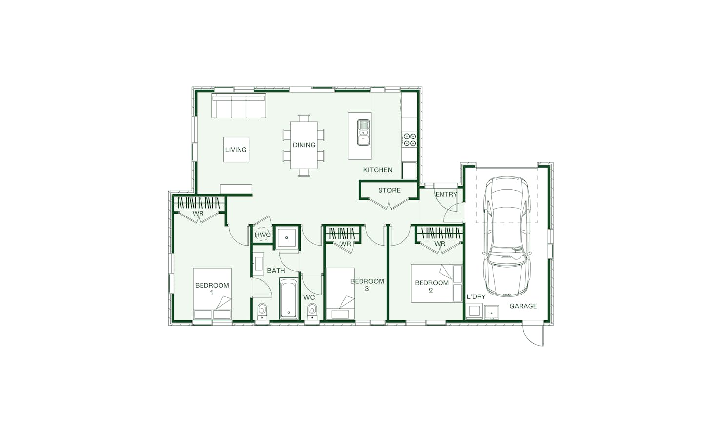 If you're looking for a cost-effective build that will hold its value, look no further than the three-bedroom Ruru. Designed to maximise smaller sites, this cleverly designed home features two double bedrooms and one flexi-room ideal for guests or young children working from home. The bathroom comes complete with all the modern must-haves, and the open plan kitchen, living and dining provide a great space ideal for entertaining.