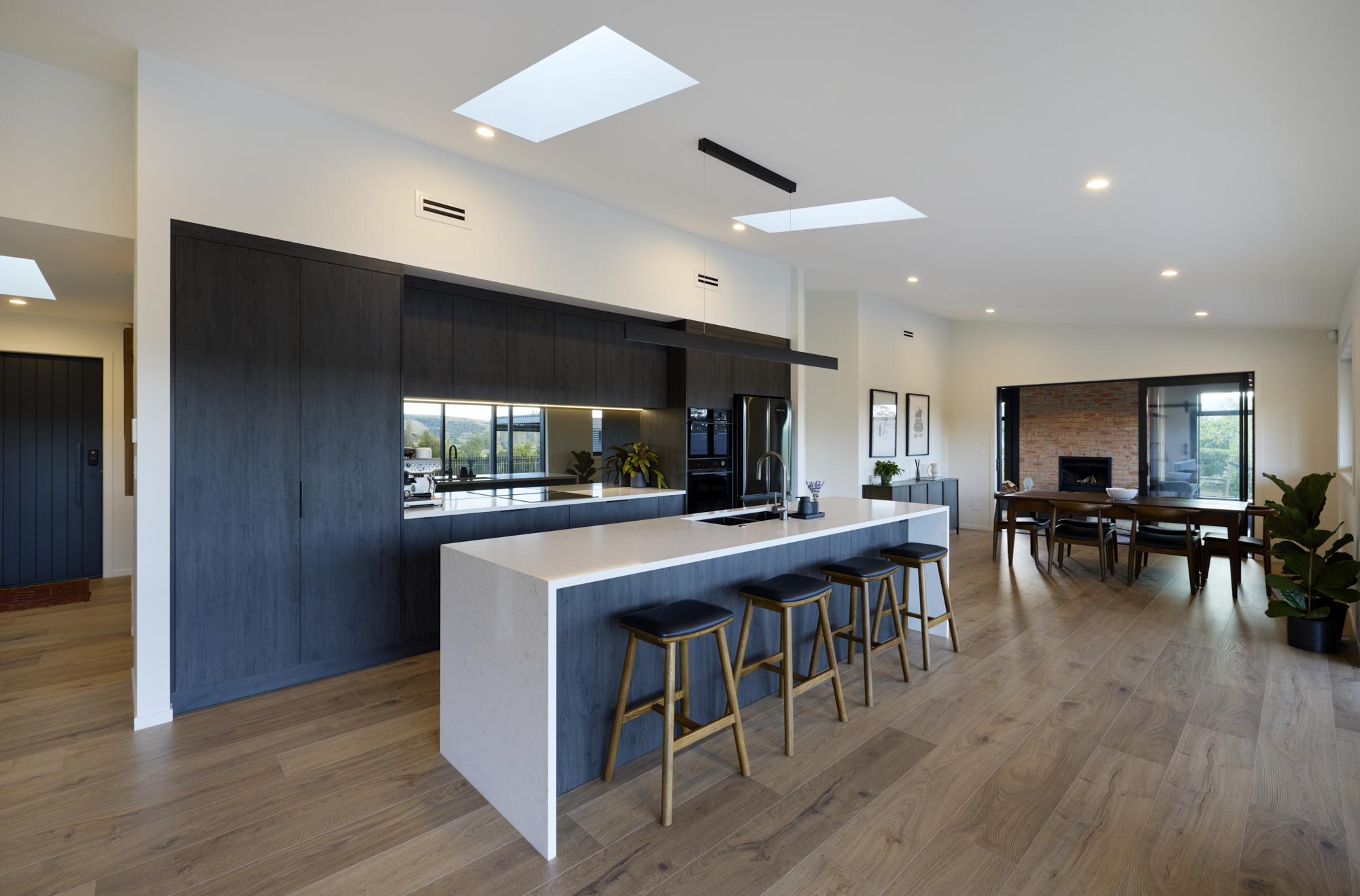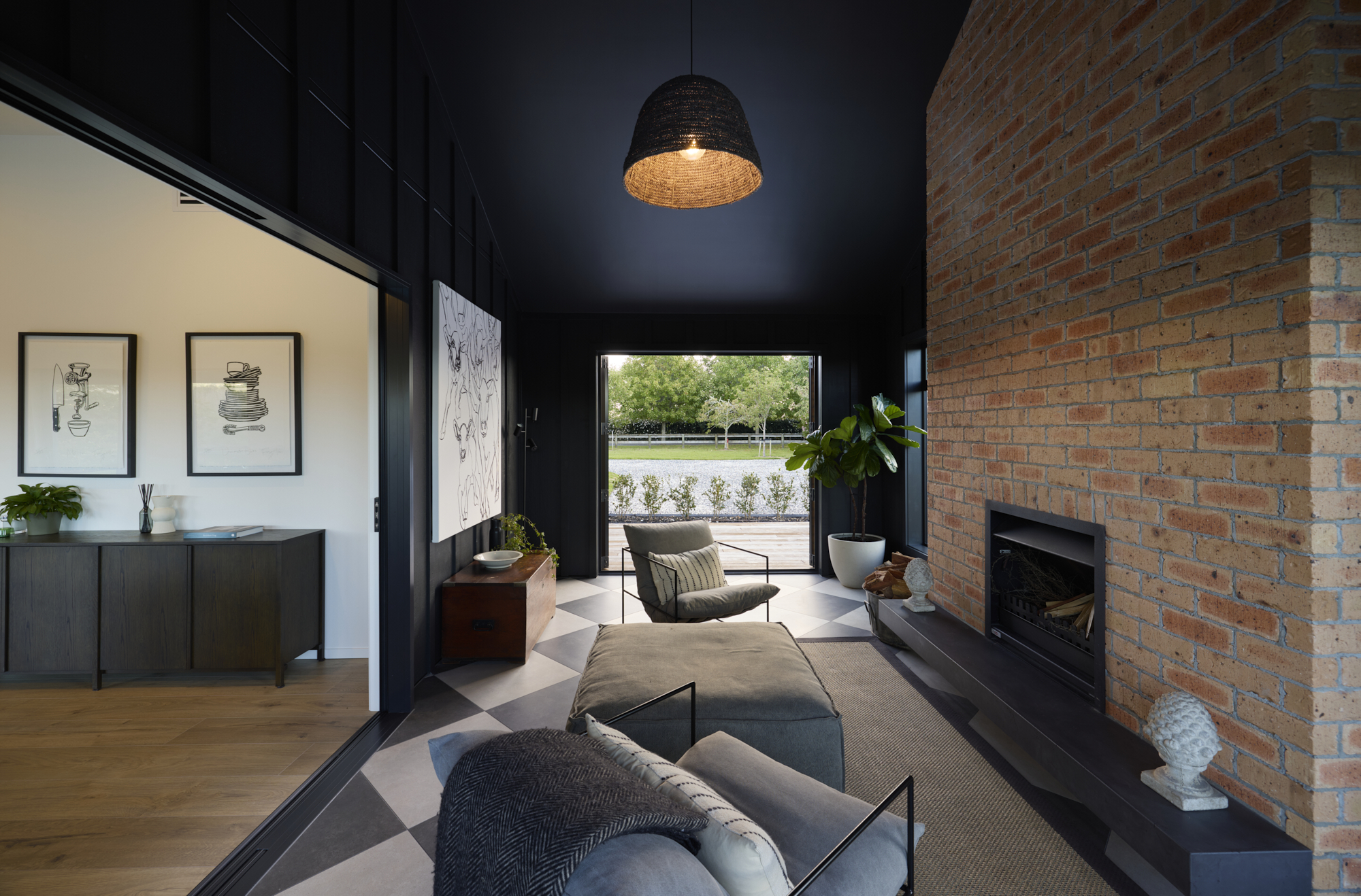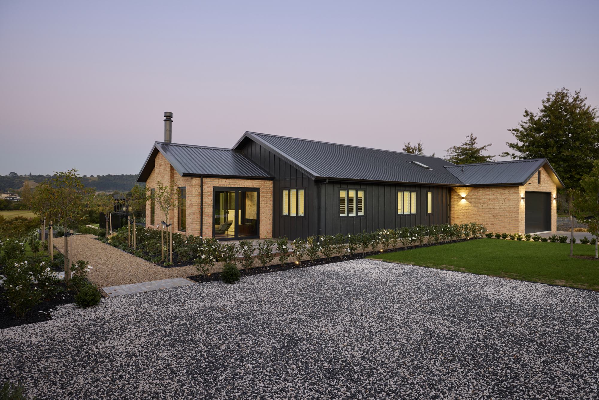 Warm brick and bold dark cladding create a striking rural character, while inside, a designer open-plan kitchen and living space flows seamlessly to a resort-style outdoor entertaining area complete with pool, pergola, and hot tub.
