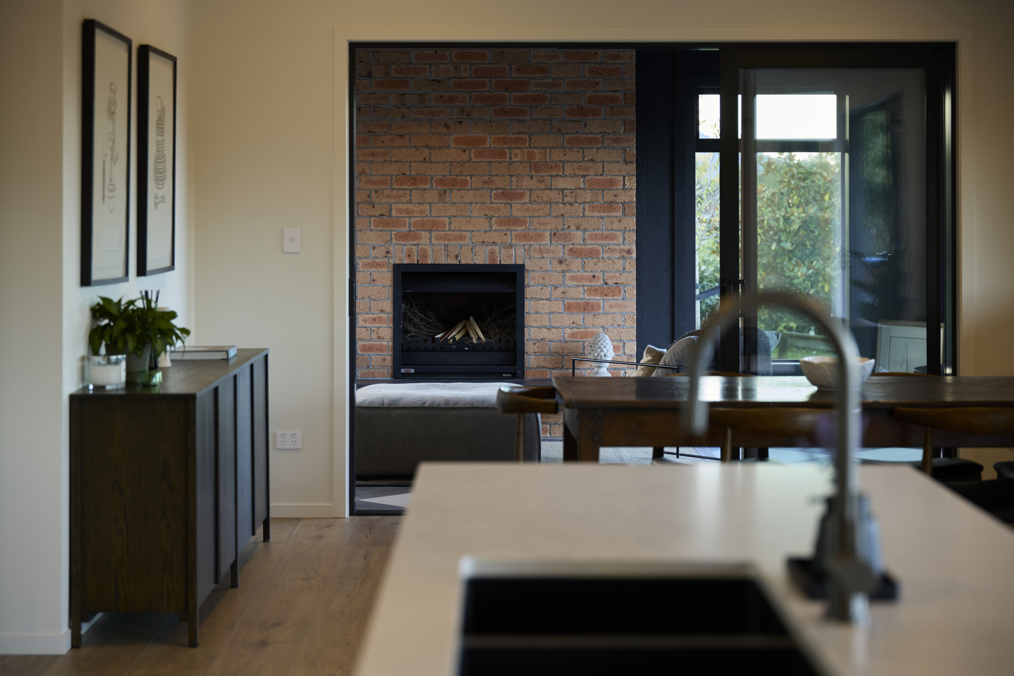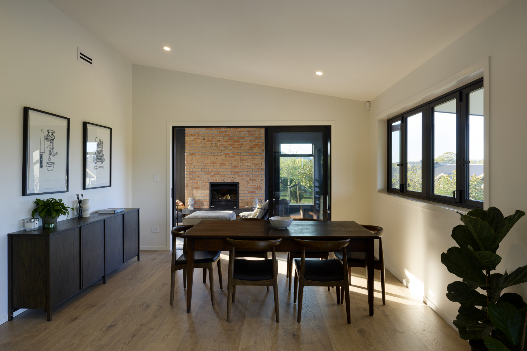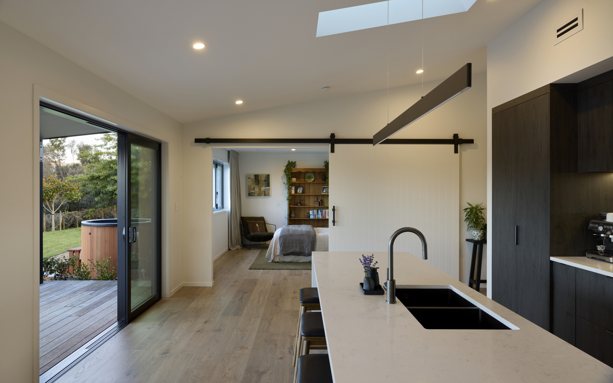 Warm brick and bold dark cladding create a striking rural character, while inside, a designer open-plan kitchen and living space flows seamlessly to a resort-style outdoor entertaining area complete with pool, pergola, and hot tub.