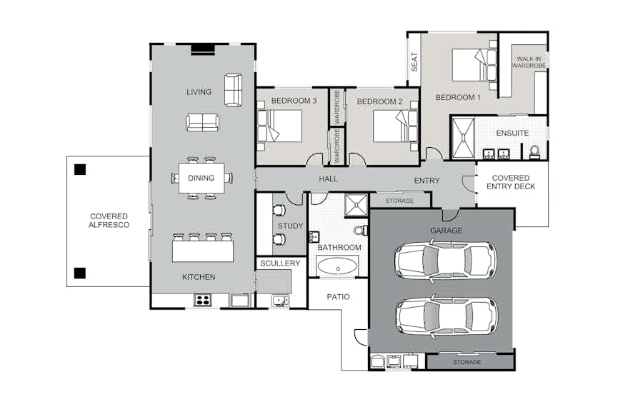 Be assured of comfortable living with the Wai build. The design showcases an effective use of space, enjoy three thoughtfully positioned double bedrooms plus a study, open-plan living area and double garage for storage