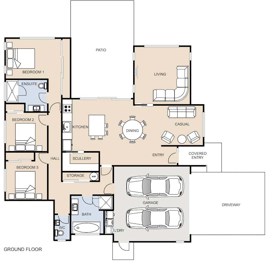 The Kiwi plan makes for an ideal family home with three generous bedrooms, open plan living and double car garaging. Daylight shines through to the modern kitchen thanks to ample windows.