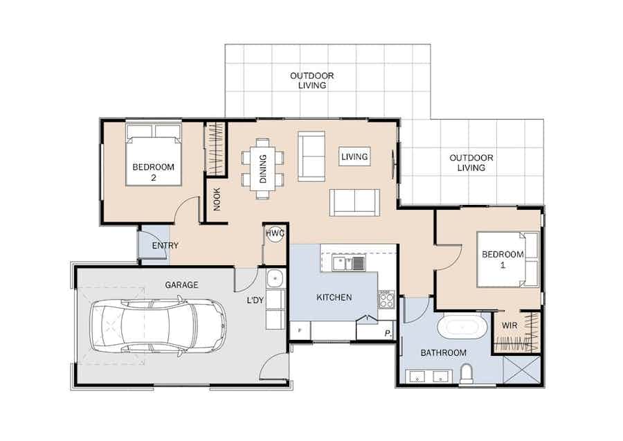 Cute as a button and versatile in many ways, our two-bedroom Mynah plan is a great way to add a minor dwelling to your residential site because the design falls under the 65m2 size regulation.
