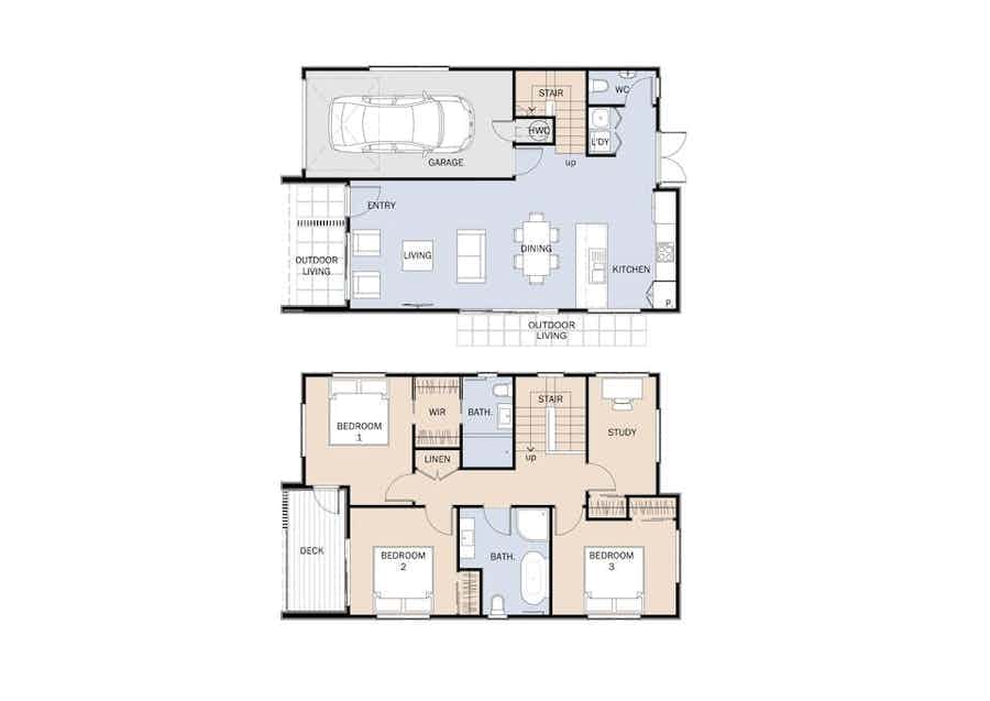 Our Wren three-bedroom plan offers a functional layout ideal for growing families with a separate living area, study nook, and large family bathroom.