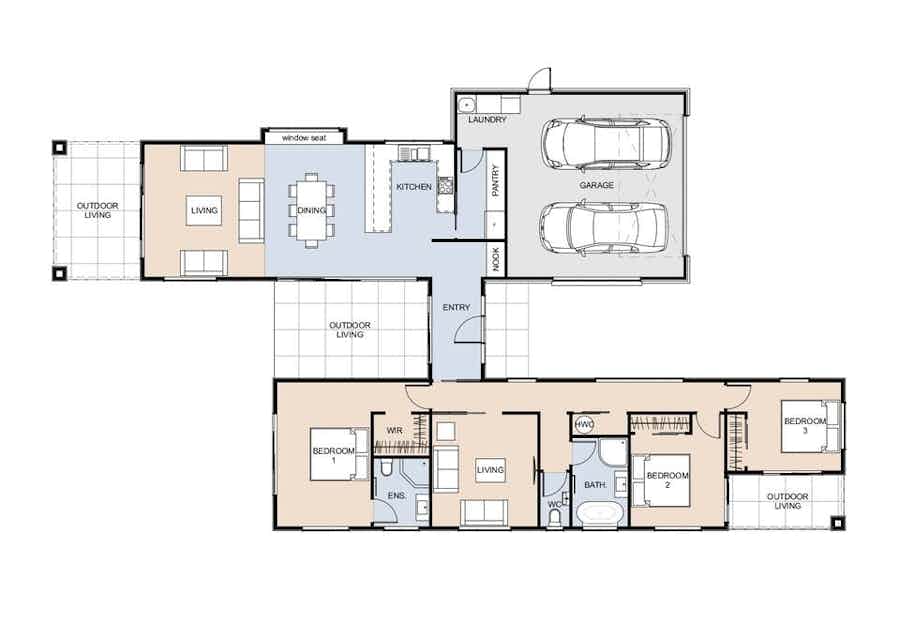 Our Fernbird plan offers an ideal family home or investment build. You will find a bedroom ideal for guests or teenagers at the entrance, with the remaining three bedrooms tucked away at the back of the home.