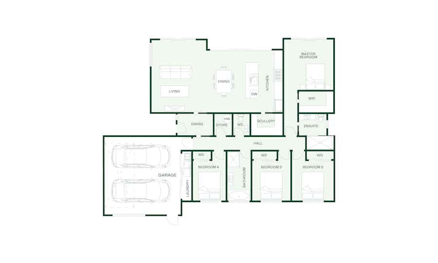 This four-bedroom Weka plan offers flexibility and space with two living areas providing options for entertaining and relaxation.