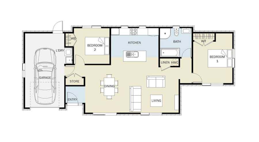 Good things come in small packages, and the Tui does not disappoint. This plan features two spacious double bedrooms, an open-plan kitchen, living and dining area and a single internal access garage.