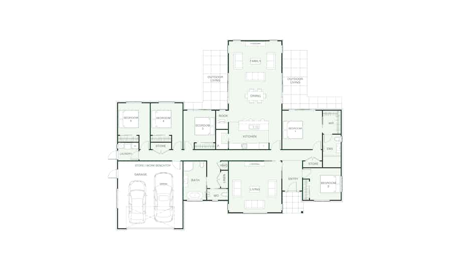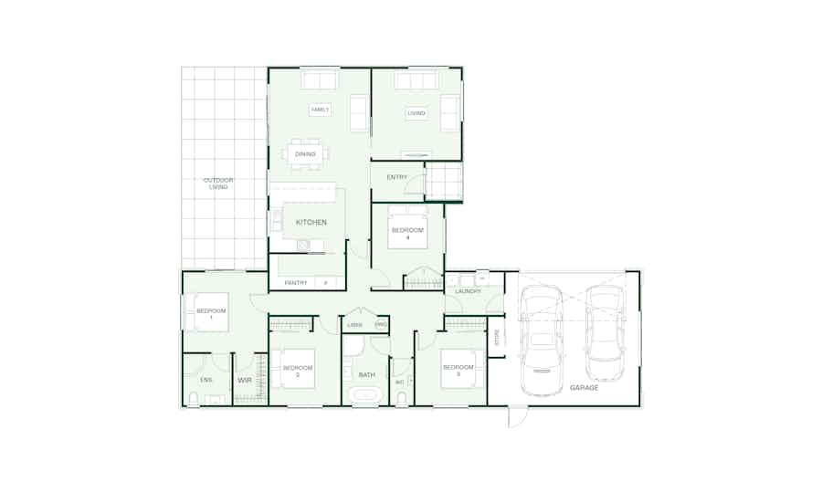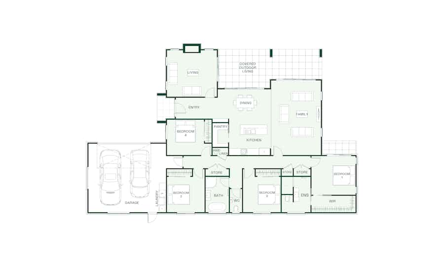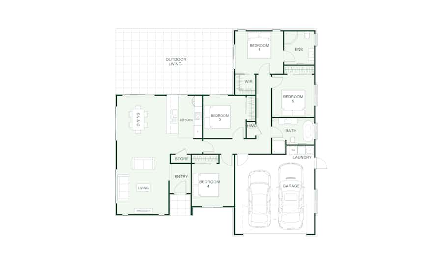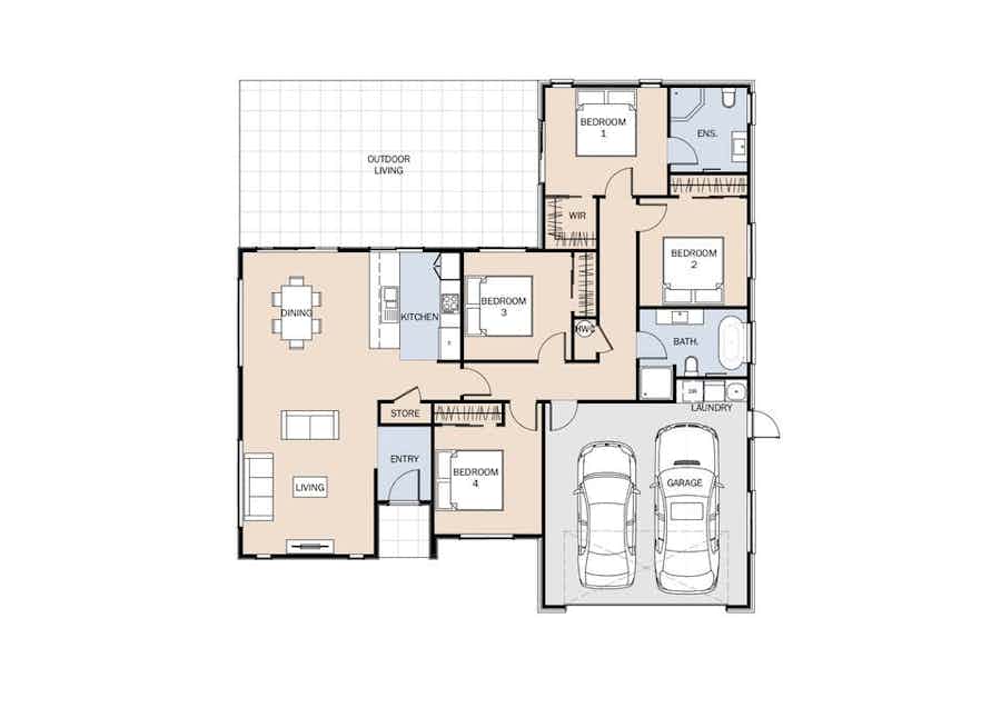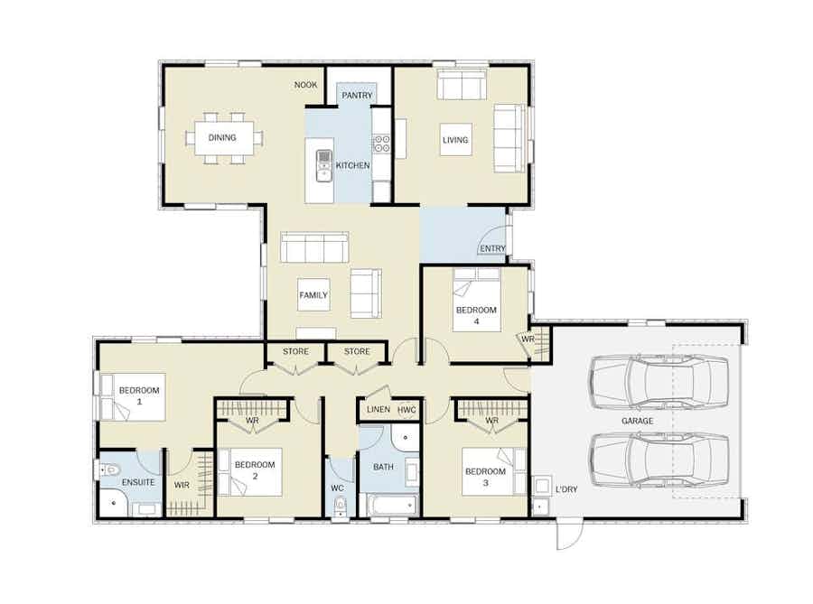 This four-bedroom Weka plan offers flexibility and space with two living areas providing options for entertaining and relaxation.