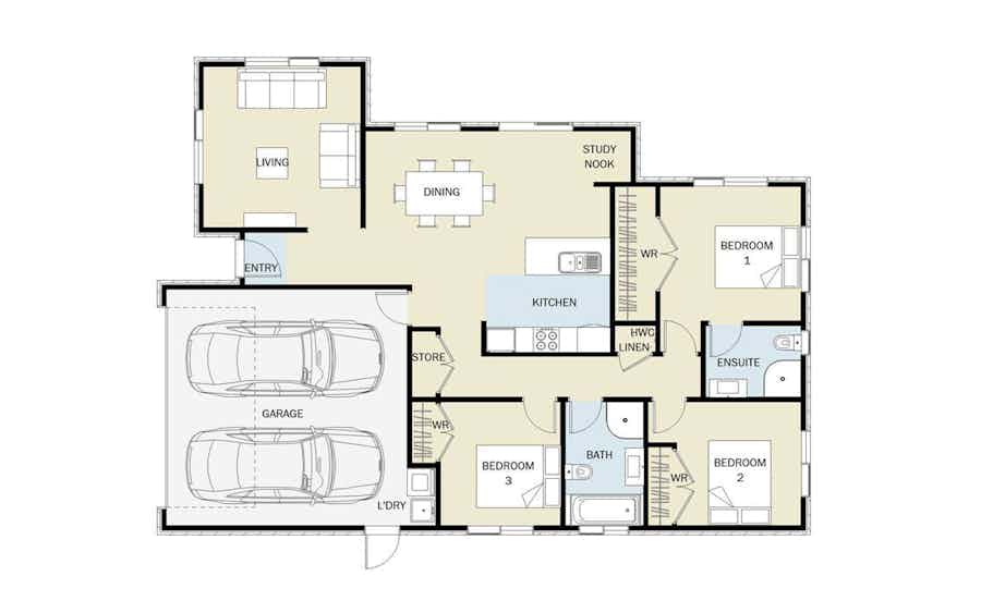Our Wren three-bedroom plan offers a functional layout ideal for growing families with a separate living area, study nook, and large family bathroom.