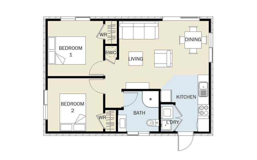 Cute as a button and versatile in many ways, our two-bedroom Mynah plan is a great way to add a minor dwelling to your residential site because the design falls under the 65m2 size regulation.