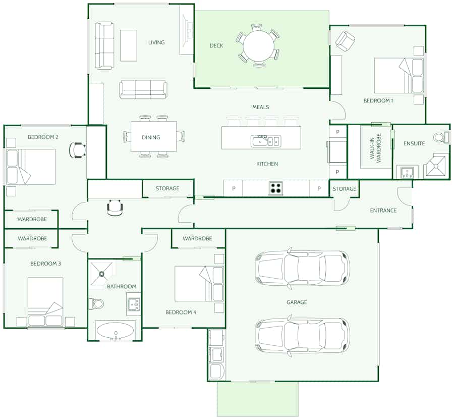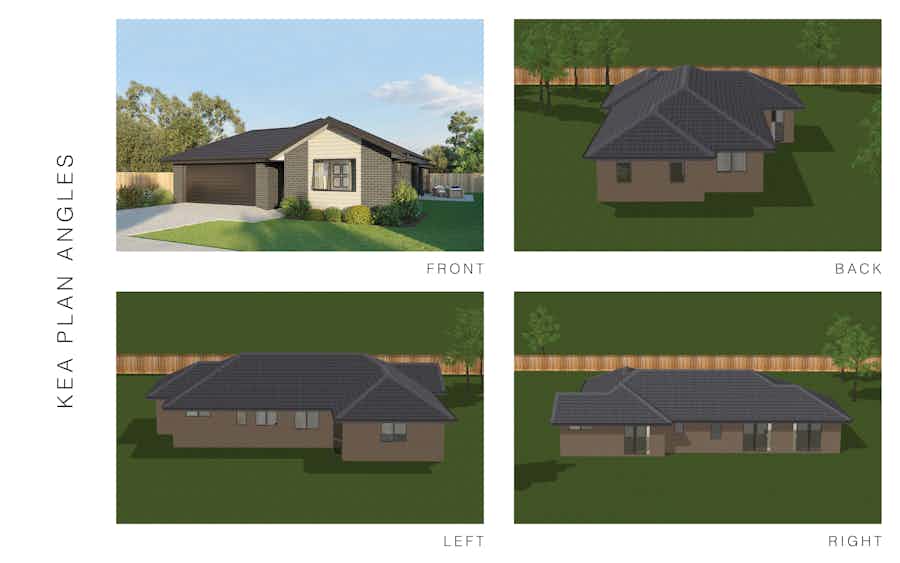 The Kea plan features four generously sized bedrooms, with the master suite positioned away from the main living spaces. The master suite includes a large walk-in robe and ensuite.