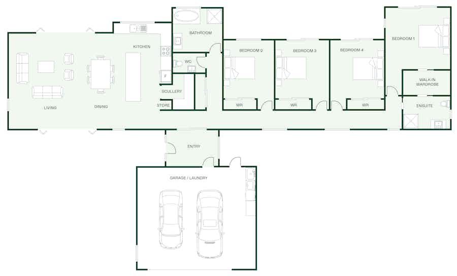 Our Fernbird plan offers an ideal family home or investment build. You will find a bedroom ideal for guests or teenagers at the entrance, with the remaining three bedrooms tucked away at the back of the home.