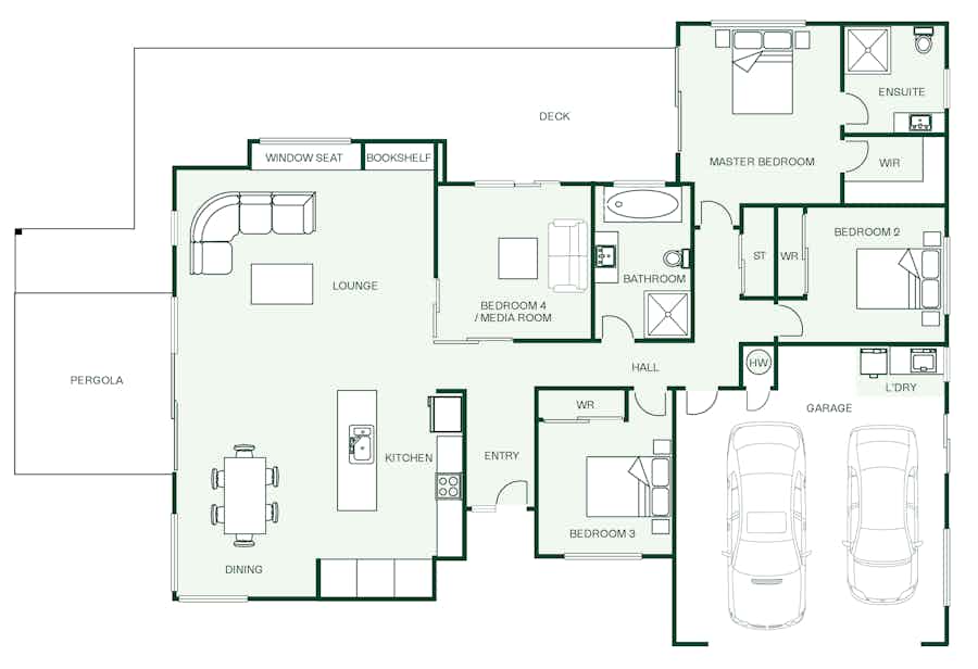 The four-bedroom Shearwater plan offers family living at its very best. This well-considered and easy to navigate floorplan features two living spaces, a generous modern kitchen and well-appointed bedrooms.