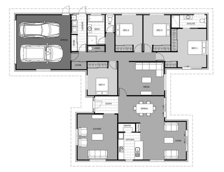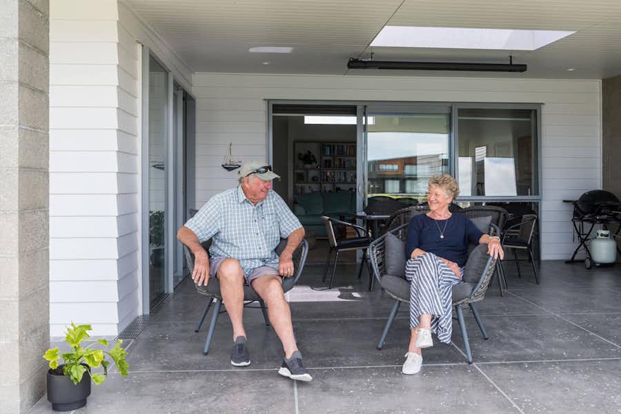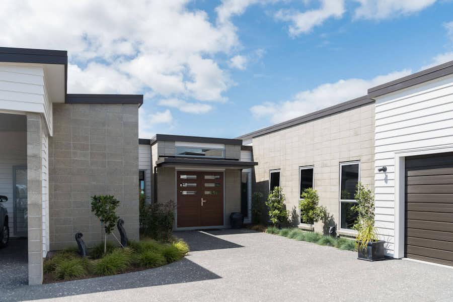 The honed-block entrance doors bordered by stack-bonded block makes for an impressive arrival. The coastal vibe of the home is reinforced with weatherboard cladding. Colorsteel roofing and trim in Ironsand gives a crisp finish.