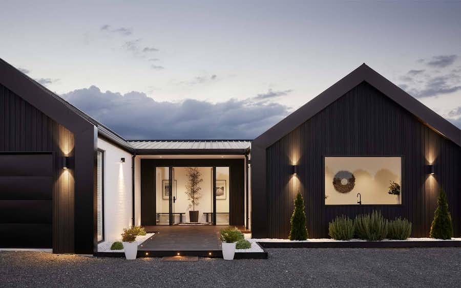 Aluminium joinery framing accentuates the gable roof lines and frames the home beautifully. An additional texture is welcomed with Single Clay bricks painted in a Resene Half Black White.