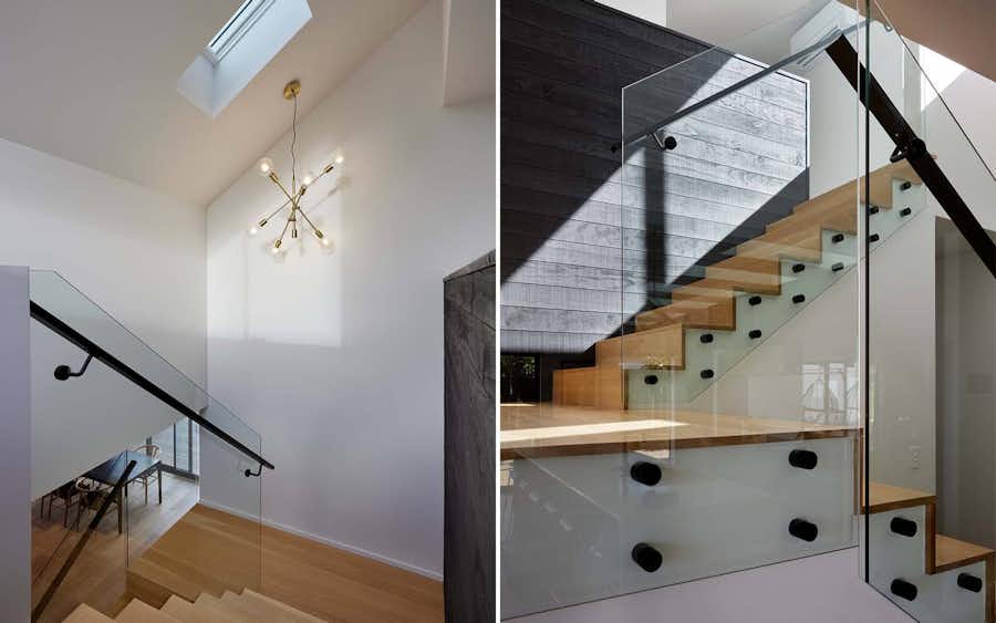The wooden floors are carried through into the stairwell, with a feature light fixture and a distressed look wood on the wall adding contrast to the space.