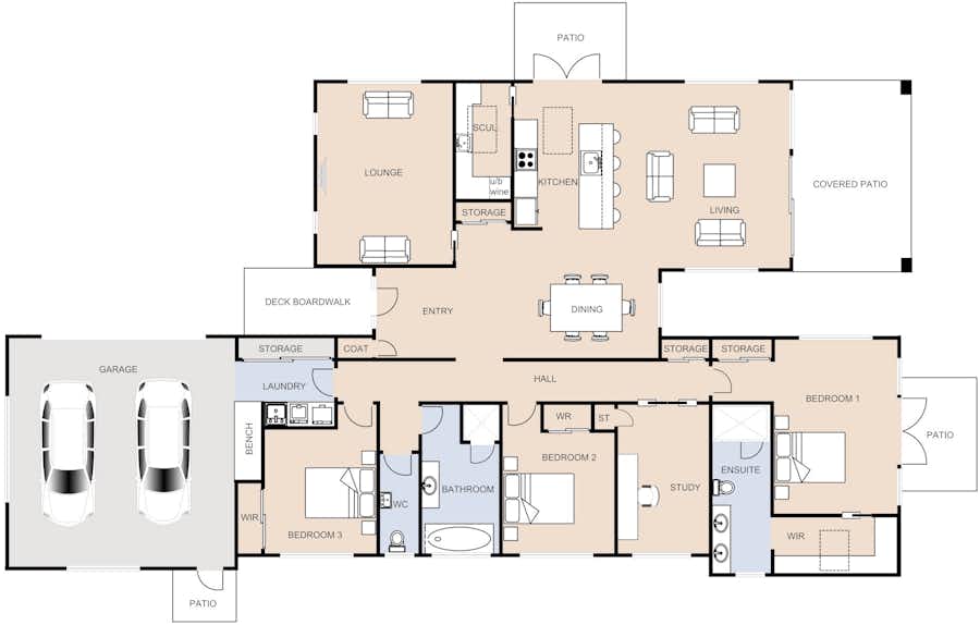 Well-considered ‘value adds’ include a cloak cupboard for guests, a spacious study to work from home, and an under bench wine fridge in the stunning scullery.