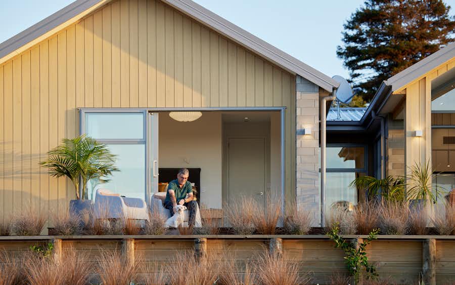 Peter and his companion Aero, the dog, enjoy a relaxed coastal lifestyle in Whakatane. Their new home is the epitome of modern lifestyle living.